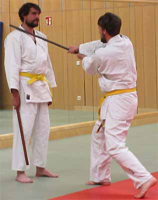 Daher üben wir im Budokan Kaufbeuren - neben dem Erlernen und Vertiefen der Grundtechniken - insbesondere die praktische Anwendung der Stocktechniken (Jutsu) im Partnertraining.